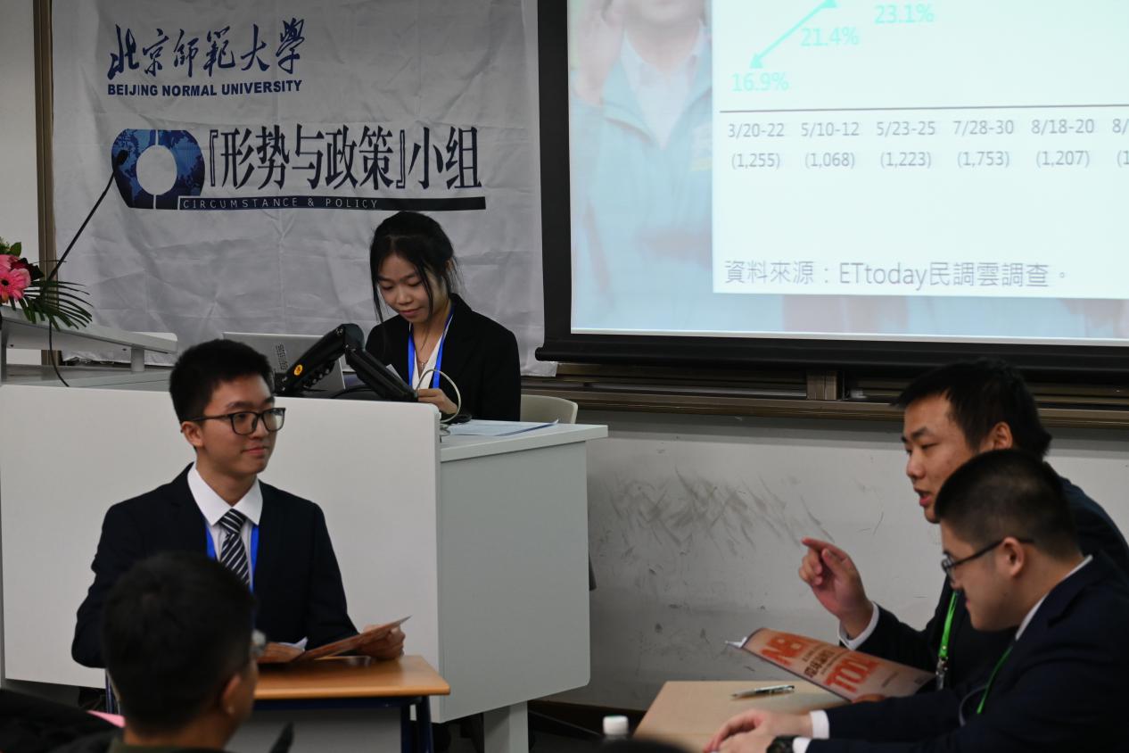 第三组代表、2022级哲学学院本科生杨佑等同学以模拟《海峡两岸》节目的形式展示主题《“蓝柯一梦”——“蓝白合”破局探析》。同学们分别饰演《海峡两岸》“代班主持人”、“邢予正时事评论员”等角色,围绕2024台湾地区领导人选举进行讲解分析。他们创造性地借用电视节目形式,首先介绍了台湾地区以国民党、民进党和民众党为代表的“蓝”“绿”“白”三股政治力量,又从岛内蓝白双方互补性和合作的潜在空间等角度重点介绍了“二对二幕僚磋商会”“马办会”“君悦会”等重要节点事件。德赢vwin体育官网登录世界近代史教研室贾珺副教授充分肯定了本组的选题的立意价值与生动形式,辩证分析了蓝白合作破裂的局面,引导大家通过对台湾地区时事的深入观察,达到筑牢知识基础、加强独立思考的自我培养目标。