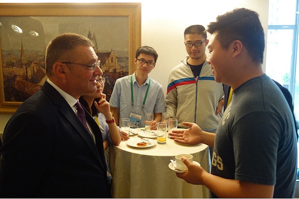 随后,路德维特参赞先带领德赢官网师生进入古朴典雅的使馆主建筑,并在一层主会议室与大家进行了亲切友好的交谈。他首先回顾了捷克与中国的传统友谊:原捷克斯洛伐克是首批与新中国建交的国家之一;1993年捷克成为独立主权国家后,长期同中国保持着良好的双边关系,并通过建立孔子学院等增进两国文化交流。欧盟同样是捷克对外交流的重要平台,历史上捷克有着很强的欧洲认同,加入欧盟为捷克的发展带来了历史性机遇。在欧盟框架下,捷克与中国通过“一带一路”战略和中国-中东欧国家“16+1”合作机制,建立起更紧密的经济文化联系。