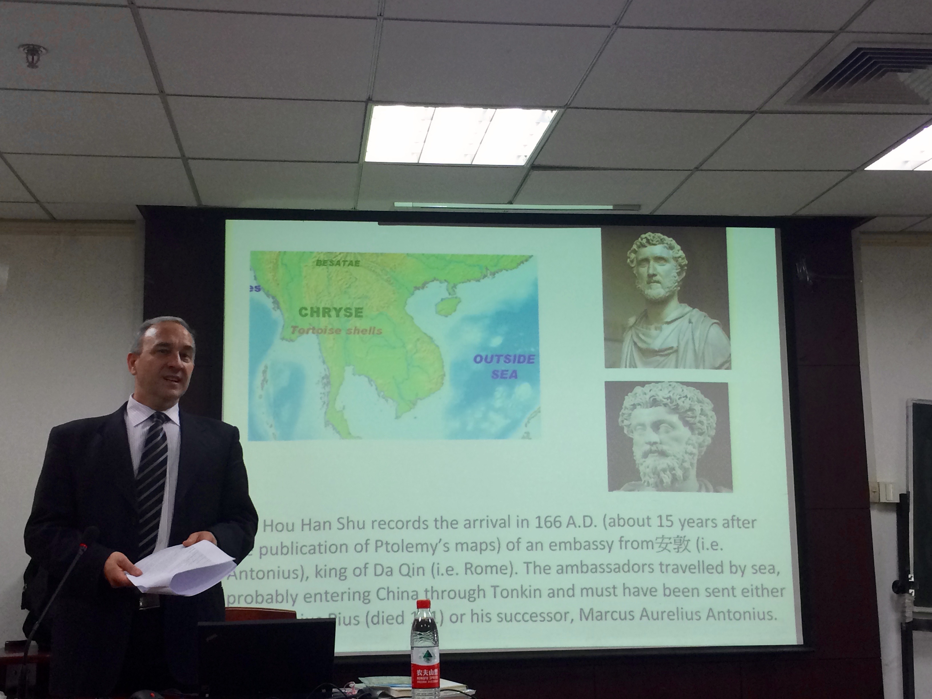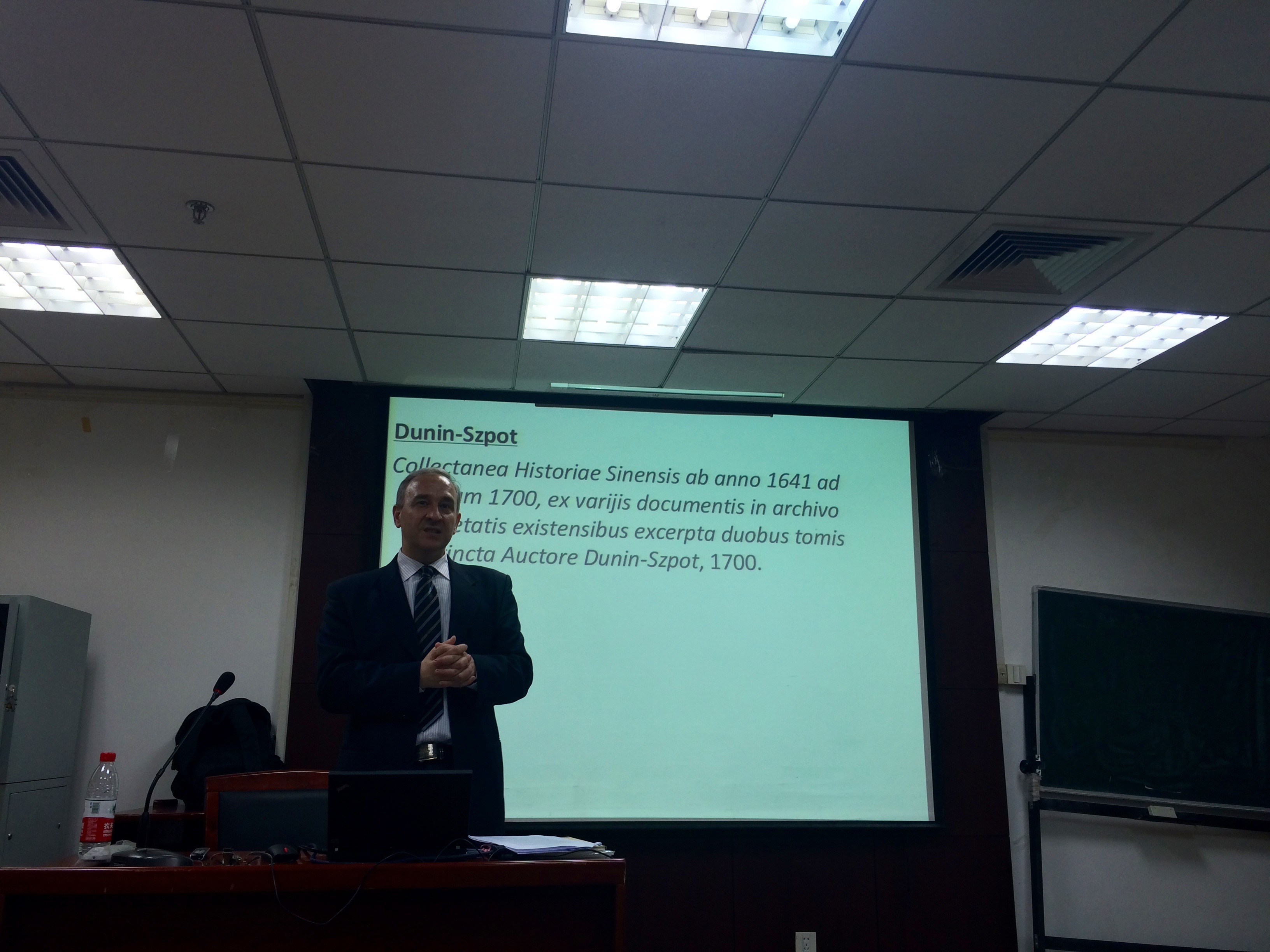 2015年4月28日上午9:30--11:30,北京外国语大学麦克雷(Ferrero Michele)教授在主楼600室做了题为《拉丁语与汉学传播》的学术报告。麦克雷教授1994年毕业于意大利都灵大学,获拉丁语和古希腊语博士学位,现为北京外国语大学欧洲语言文化学院外籍专家,拉丁语言文化研究中心主任,主要研究领域为拉丁语和西方古典文化。此次讲座由德赢vwin体育官网登录倪滕达老师主持。来自德赢vwin体育官网登录及北京外国语大学等其他高校的部分学生到场聆听。