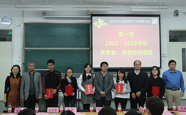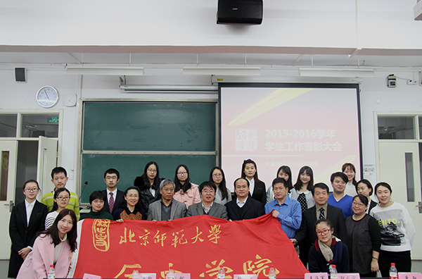 大会首先由姜海军老师宣读2015-2016学年本科生国家奖学金、国家励志奖学金、京师奖学金、专项奖学金、社会奖学金以及三好学生等荣誉称号获得者名单;李帆老师宣读2015-2016学年研究生国家奖学金、学业奖学金、专项奖学金、社会奖学金等荣誉称号获得者名单。随后进行大会第二项,郭家宏老师宣读白寿彝史学论著奖本科生组获奖名单。大会第三项流程是2016年度学生工作颁奖,在播放德赢vwin体育官网登录2015-2016学年学生工作回顾展示视频后,王卓凯老师宣读了各项国家级、市级及校院两级学生工作教师、集体类奖项获奖名单;湛晓白老师和朱敏老师分别宣读了校级和学院学生工作获奖学生名单。院长杨共乐老师、副院长李帆老师、副院长姜海军老师、分党委副书记王卓凯老师、世界近代史教研室主任郭家宏老师为获奖代表颁奖,并与获奖代表合影留念。