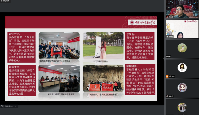 其后,白洁也对中国人民大学历史学科发展、思政建设、学生工作等方面进行了简要介绍,并由刘洪昌、郭相宜对负责领域进行详细阐述。