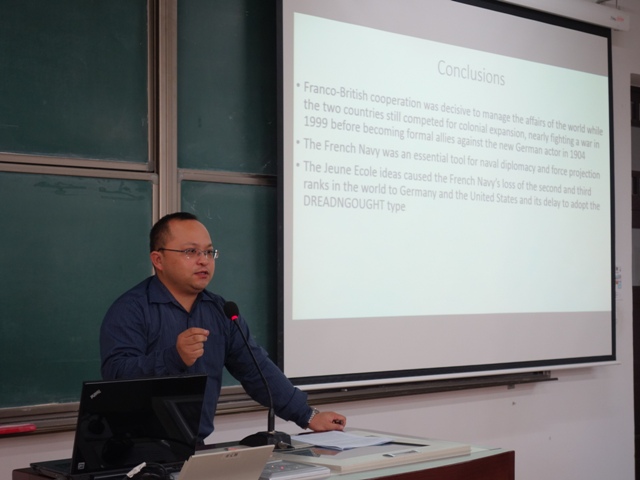2015年12月10日-13日,应德赢vwin体育官网登录邀请,法国国家海军史研究中心首席专家、知名学者亚历山大·谢尔东-杜普莱教授(AlexandreSheldon-Duplaix)前来德赢vwin体育官网登录讲学。12月11日上午,杜普莱教授走进《世界近代史》课堂,在教二教室为德赢vwin体育官网登录级本科生作了题为《走向无畏之海——铁甲舰时代的法国海军》的讲座。讲座由德赢vwin体育官网登录世界近代史教研室江天岳博士主持。德赢vwin体育官网登录世界现代史教研室贾珺副教授出席了讲座。前来聆听的还有来自德赢vwin体育官网登录和其他首都高校的学生和军事史爱好者。