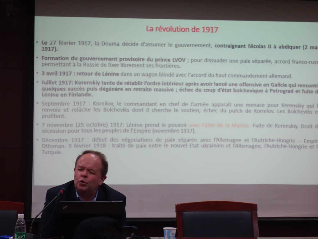 5月27-30日,应德赢vwin体育官网登录邀请,法国国家海军史研究中心首席专家、知名学者亚历山大.谢尔东-杜普莱教授(Alexandre Sheldon- Duplaix)来我校访学。5月29日下午,杜普莱教授在主楼600会议室作了题为“1917年前的沙俄海军”的学术讲座。本次讲座系我校励耘学术讲堂历史学系列讲座之一,也是纪念俄国十月革命100周年专题学术活动的重要部分。讲座由德赢vwin体育官网登录世界近代史教研室江天岳博士主持,德赢vwin体育官网登录世界近现代史研究中心主任张建华教授、世界现代史教研室主任安然老师、世界现代史教研室王广坤老师等出席了讲座。