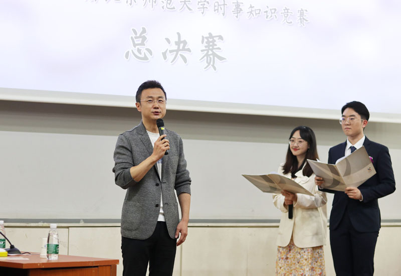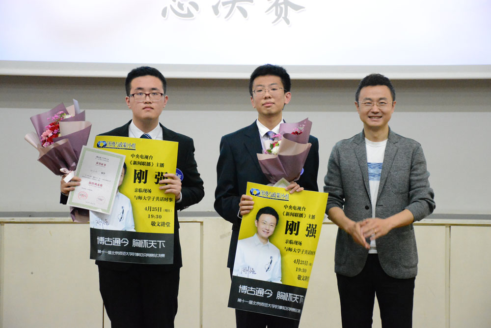 特邀嘉宾刚强为获得最佳风采奖的同学颁奖,并对全场比赛进行了点评。他称赞比赛题目设计巧妙,选手表现出众,令人意犹未尽。他还对德赢vwin体育官网登录依托“形势与政策”小组在学生思想政治教育方面所取得的成果表示充分的肯定,称赞师大青年学子具有大情怀、大视野,勉励大家拥有更大的格局、取得更大的作为。刚强结合在《新闻联播》的工作经历,鼓励同学们继续关注新闻和时事,心系民族命运、祖国发展和人民福祉,了解历史,昭示当下,启迪未来。