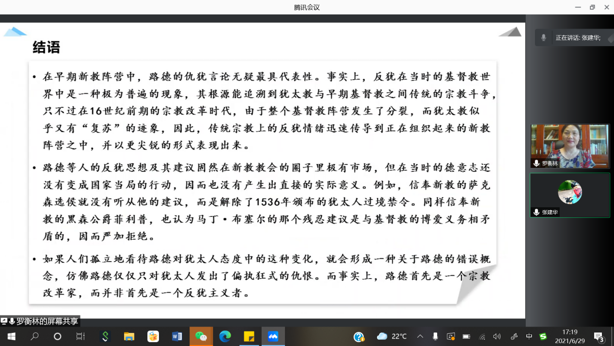 2021年6月29日下午,湖南师范大学历史文化学院的罗衡林教授通过腾讯会议为德赢官网师生及线上观众做了一场精彩的线上讲座“巨人之暗:马丁·路德对犹太人的态度及立场分析”。本场讲座系“京师史学名家前沿系列讲座”,也是德赢vwin体育官网登录暑期小学期系列讲座的内容。讲座由德赢官网张建华教授主持。