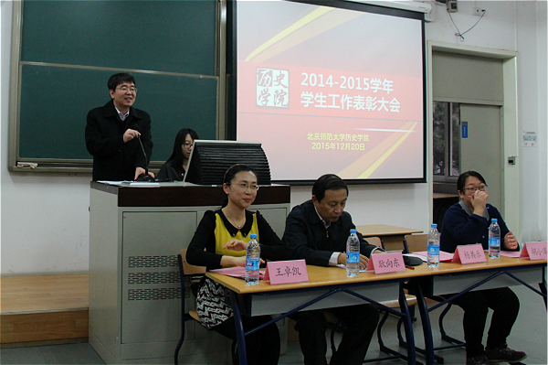2015年12月20日,德赢vwin体育官网登录2015年学生工作表彰大会在教四201召开。本次大会旨在表彰过去一年中有突出贡献的集体和个人,并颁发国家奖学金、国家励志奖学金、京师奖学金、白寿彝史学论著奖、三好学生等多个奖项和荣誉称号,鼓励全体同学在新的一年里继续向前,不断开拓创新。