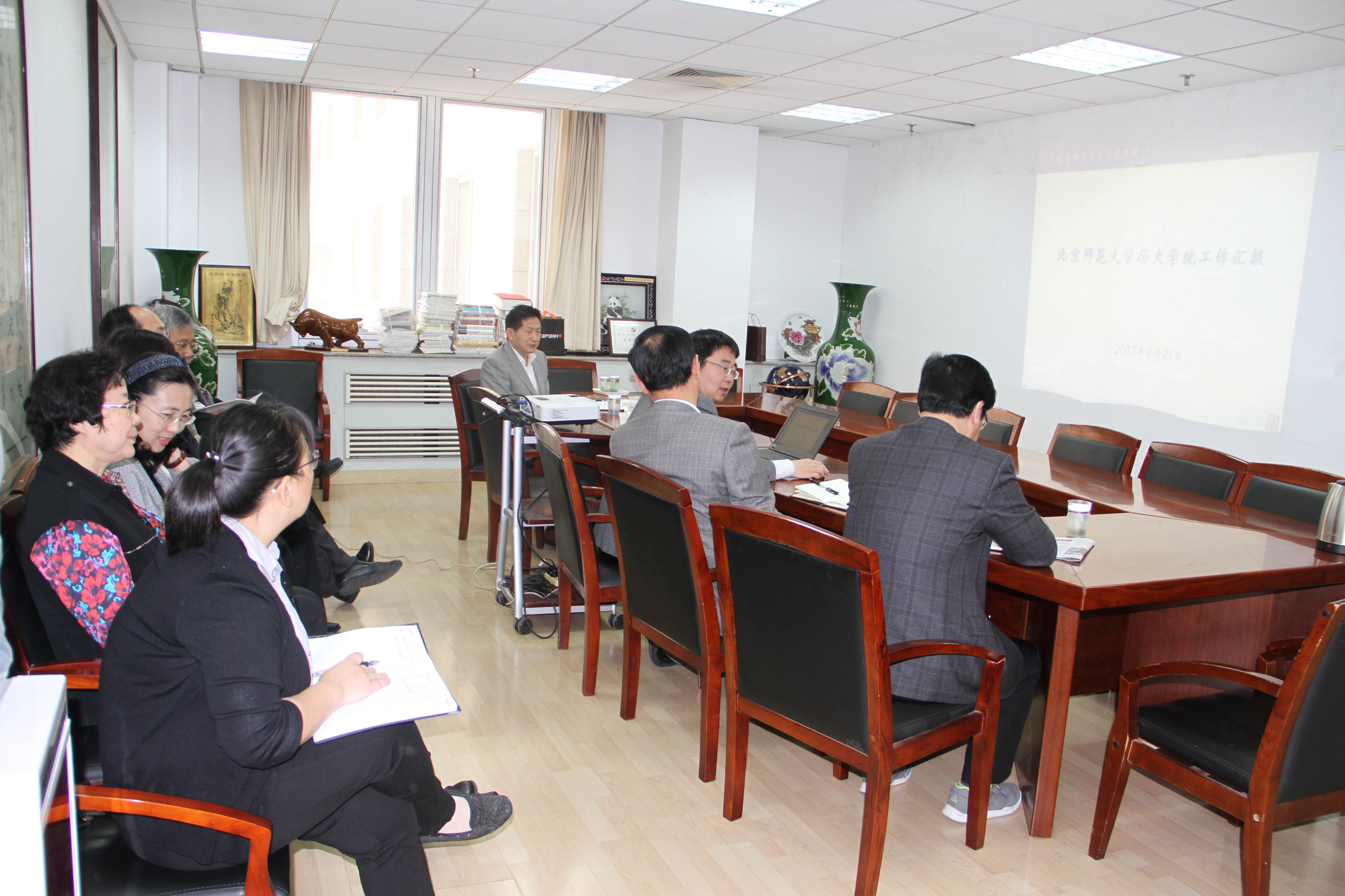 首先,杨共乐院长汇报德赢vwin体育官网登录基本情况。他简单介绍了德赢vwin体育官网登录的发展历程,着重从科学研究、教学工作、社会服务等角度介绍了德赢vwin体育官网登录近年来所取得的突出成绩,在发展历程中为党和国家培育英才、为学科发展作出的贡献。同时,也将师资队伍数量与结构、基本办公与科研条件、招生培养等方面面临的困难与挑战进行了简要分析。之后郭家宏书记介绍了德赢vwin体育官网登录党员培养、支部建设、党建创新和学生工作等方面的工作。