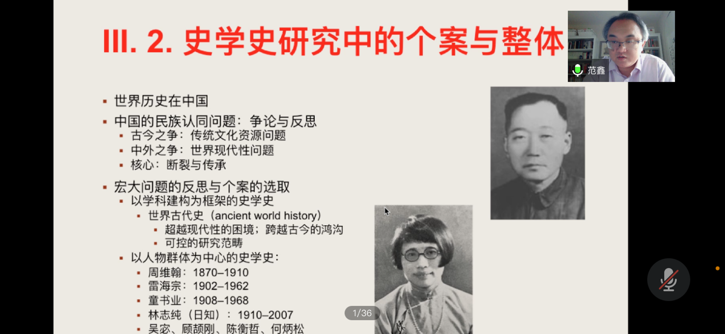 史学史在全球视野的发展是本次讲座的重点。范鑫老师旨在向大家介绍中国世界史研究的丰富而多元的起源,特别着重强调经学的发展对二十世纪初世界历史观念形成的作用,以及中国学者在引介西方的世界历史理念过程中的反思与创建。他从如下几方面对此展开详细论述:史学史的创新与传承;史学史研究中的个案与整体;史学史的研究材料;史学史研究中的历史唯物主义问题;中国世界史学史的世界价值。