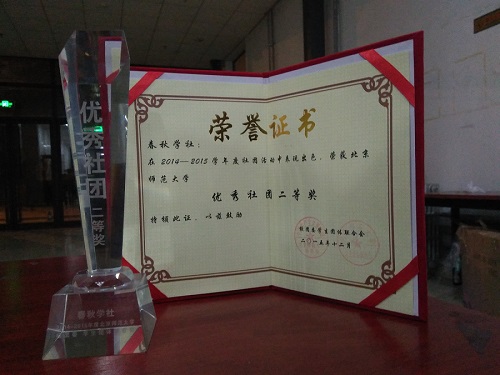 12月5日晚8时,第十九届社团文化节闭幕式暨“十九社氏度”社团盛典在学生活动中心成功举办。德赢vwin体育官网登录春秋学社凭借丰富多彩的活动以及社员们在优秀社团答辩中的精彩表现,荣获2014-2015年度优秀社团二等奖第一名。春秋学社指导教师李力老师作为嘉宾出席本次晚会,并受邀为获奖社团颁奖。学社多数成员参加了晚会,在欣赏表演的同时更为社团感到自豪。