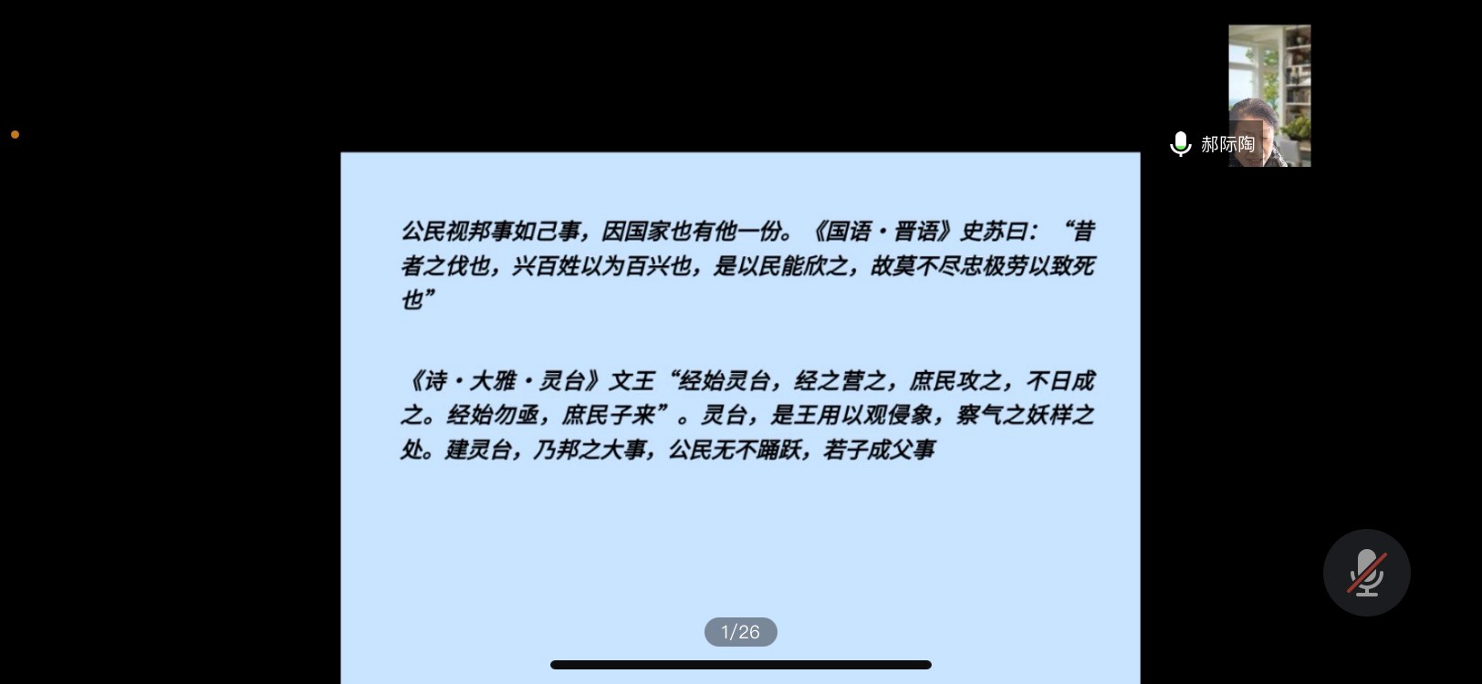 郝际陶教授接着阐释雅典人与周人在自己城邦中所享有的权利与义务。城邦就是公民的国家。在这样一个政治实体内,每一个公民最重要的权利就是土地所有权与政治权。唯有参与城邦的政治、经济、军事、宗教活动,服从城邦的法律,公民们才能实现自己的权利和义务。周国人和希腊公民均视邦事如己事。