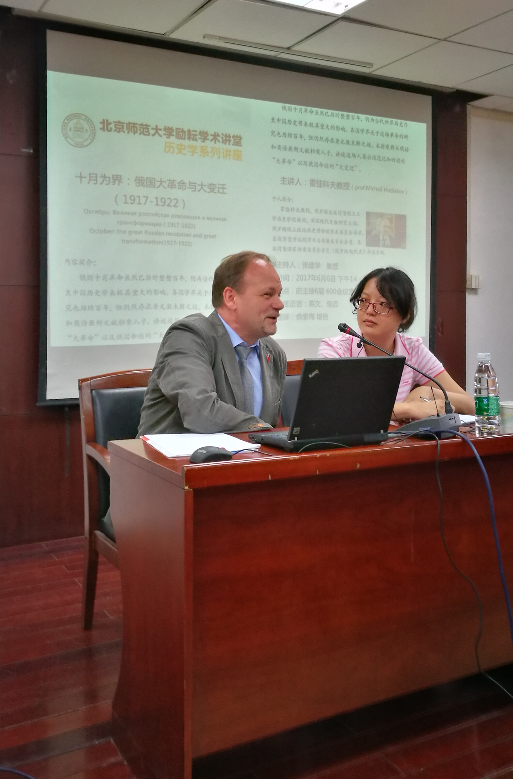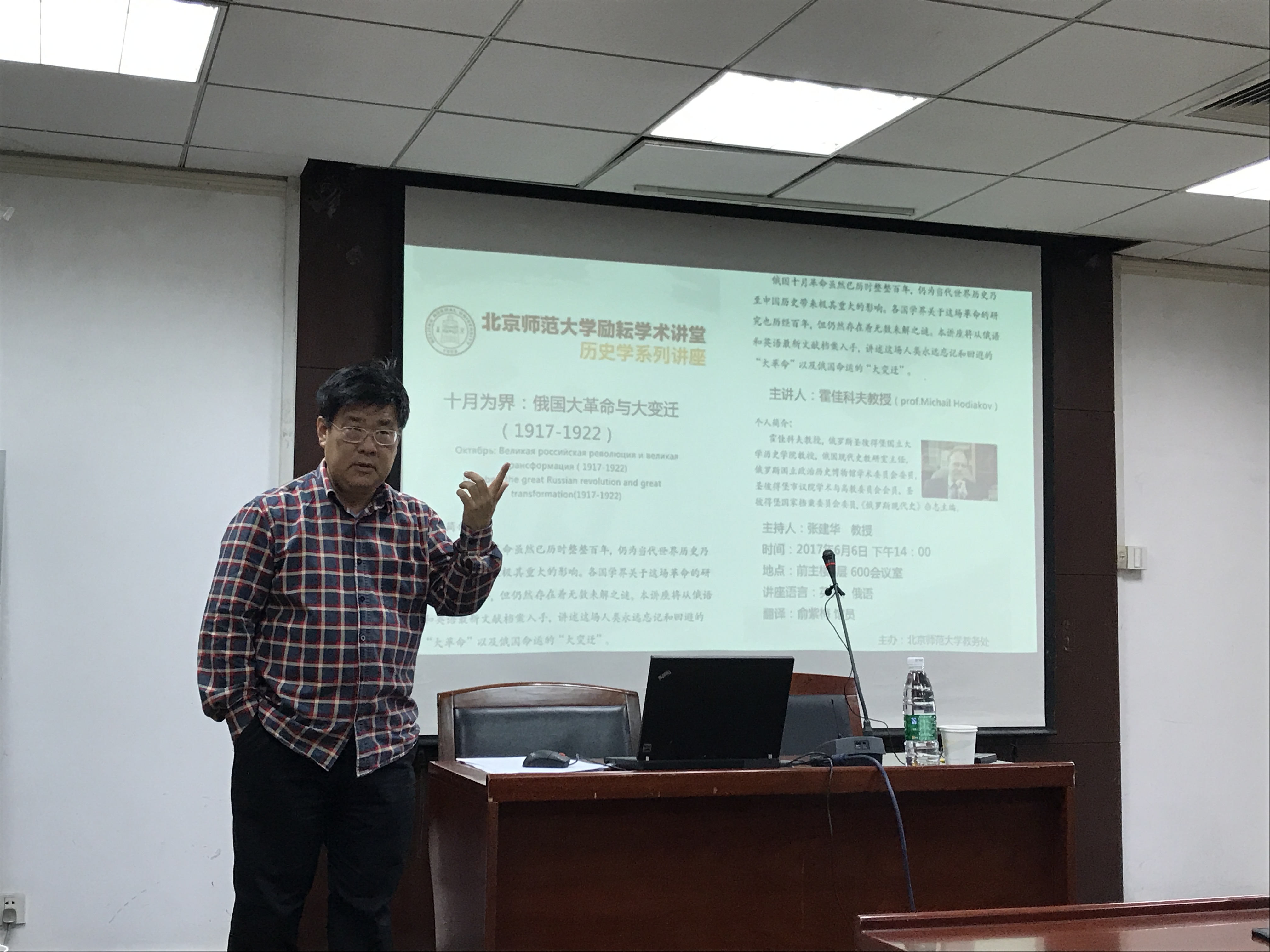 光临讲座现场的有原中国驻白俄罗斯大使馆新闻参赞、《中国青年报》驻俄罗斯首席记者、莫斯科外国记者协会主席、国务院欧亚社会发展研究所前副所长,现任中国人民大学俄罗斯研究中心副主任王宪举教授、北师大德赢vwin体育官网登录德国史专家孙立新教授、北师大德赢vwin体育官网登录日本史专家陈奉林教授、北师大德赢vwin体育官网登录法国专家江天岳讲师,以及来自我校其他院系的师共计40余人听取了讲座。讲座由德赢官网张建华教授主持,由我校图书馆研究馆员、德赢vwin体育官网登录博士生俞紫梅担任全程翻译。