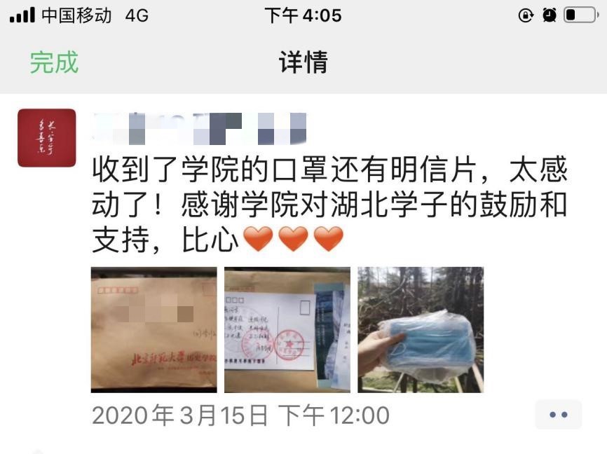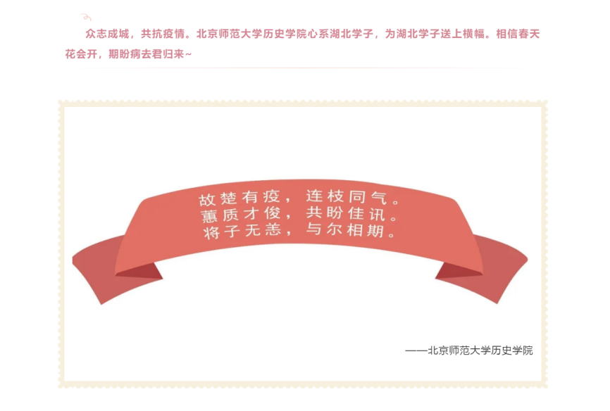 “故楚有疫,连枝同气。蕙质才俊,共盼佳讯。将子无恙,与尔相期。”3月7日女生节,德赢vwin体育官网登录师生撰写了为湖北人民加油打气的祝福语,表达了对湖北师生的关怀与牵挂。3月13日,中华儒学联合会赵毅武先生委托宁欣老师捐赠给学院口罩,学院将其转赠身处湖北地区的20名师生,一并寄往疫区的还有学院给每一位学生的寄语及书签。