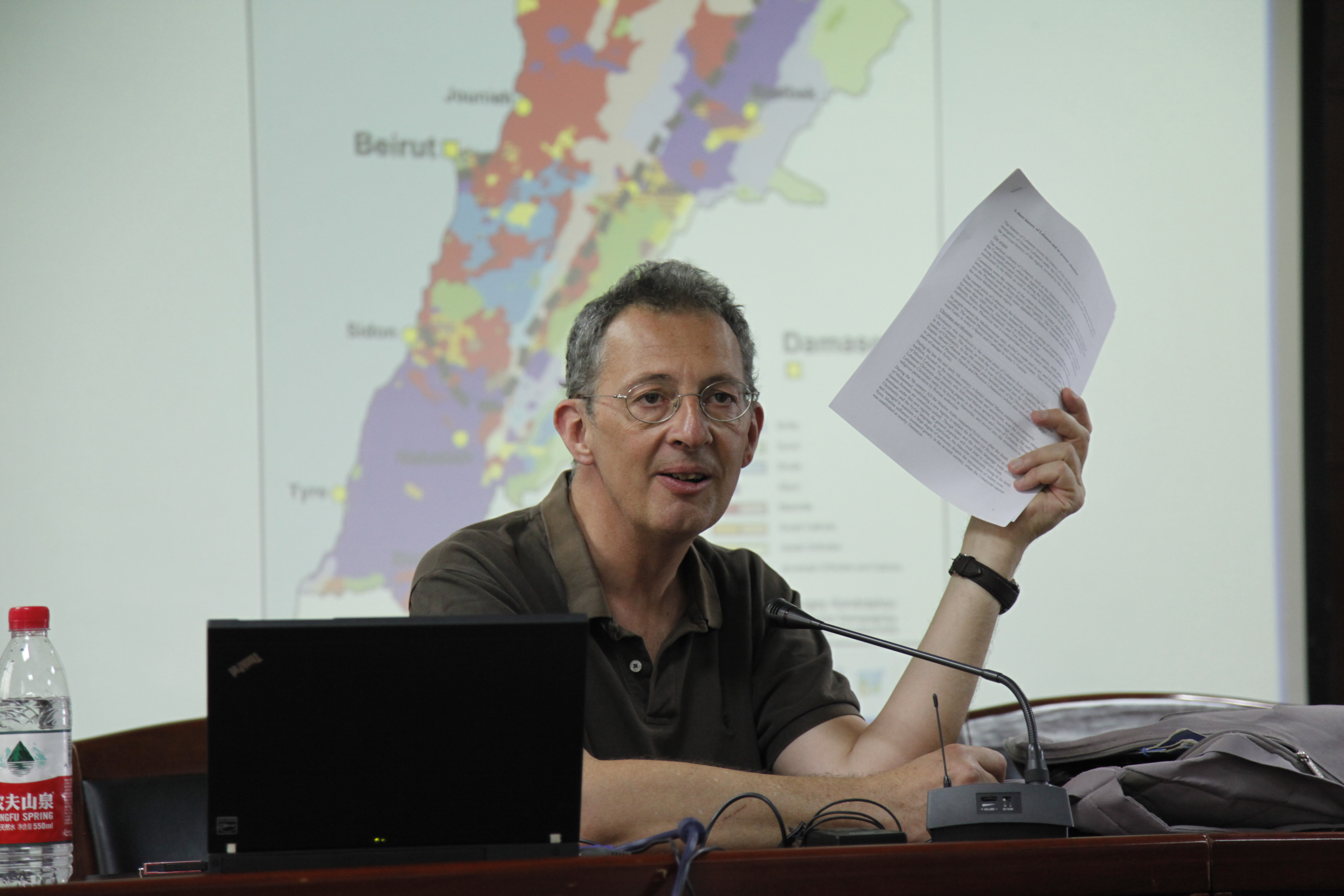在接下来的提问环节中,雷蒙教授和我校师生探讨了历史上黎巴嫩在东西方经济、文化交流中的重要作用,介绍了现在黎巴嫩人民为维护多元宗教做出的努力。最后,刘林海教授对本次讲座作了点评,他指出,东西方交汇的地理位置是黎巴嫩地区的重要特征,这不仅使该地拥有文明交流的悠久历史,也为这一地区的发展带来了机遇与挑战。在目前国家推进“一带一路”战略的时代背景下,我们更要重视文化交流的历史,为促进沿线国家政治互信、经济融合、文化包容提供历史借鉴。