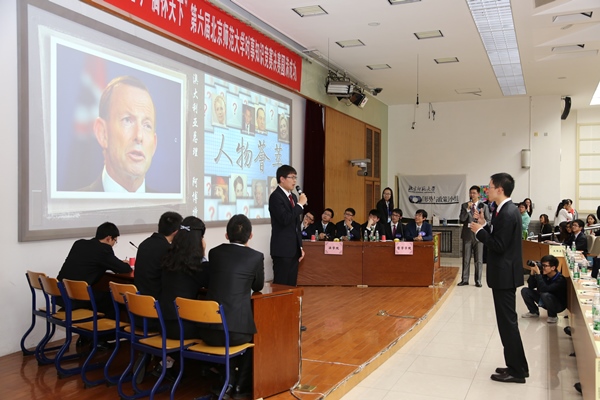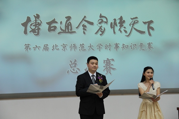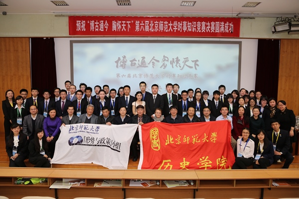 德赢vwin体育官网登录党委副书记刘利老师,党委宣传部新闻中心常务副主任、机关一总支书记李美仙老师,研究生工作处处长应中正老师,本科生工作处处长王洛忠老师,校团委书记袁慧老师,本科生工作处副处长隋璐璐老师,校电视台台长齐松老师,德赢vwin体育官网登录院长杨共乐老师,德赢vwin体育官网登录分党委书记耿向东老师,德赢vwin体育官网登录副院长姜海军老师,德赢vwin体育官网登录分党委副书记王卓凯老师,教育学部学生工作办公室主任刘立老师,法学院分党委副书记魏天经老师,政府管理学院分党委副书记郭智芳老师,德赢vwin体育官网登录中国近代史教研室教授李志英老师,政府管理学院国际关系专业教授李兴老师,德赢vwin体育官网登录世界近代史教研室庞冠群老师、贾珺老师,校研究会主席毕硕同学等嘉宾也出席了当晚的决赛。出席比赛的还有来自国际关系学院、清华大学、北京大学、南开大学、对外经贸大学和北京电子科技学院等高校时事研究团体的负责人。 因故未能出席参加活动的中央电视台著名新闻主播贺红梅老师给组委会寄来祝福,对师大学子的知识素养和综合能力给予高度肯定,并预祝“博古通今胸怀天下”活动圆满成功。
