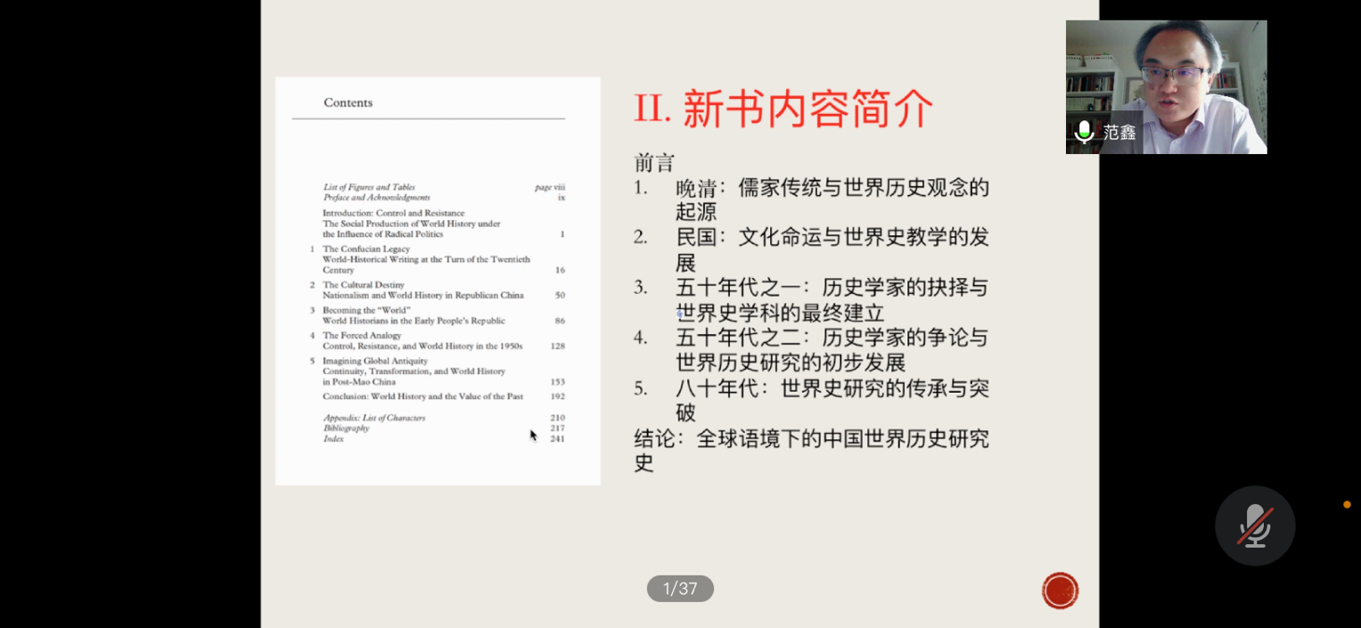 2021年5月16日晚,应德赢官网倪滕达副教授的邀请,美国纽约州立大学弗雷多尼亚分校历史系范鑫副教授通过网络平台为师生们作了一场精彩的专题讲座。该讲座以“世界历史与中国认同”为主题,系“京师史学名家前沿系列讲座”之一。