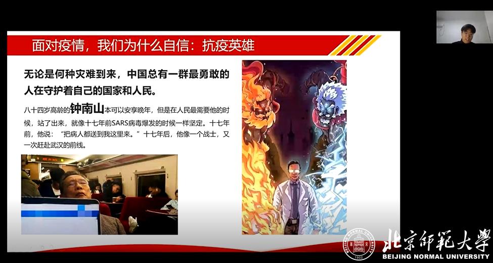 “英雄的关键在哪儿?不在于他外在的外表是什么样的,而是在于他的内心,在于英雄的精神特质。”屏幕前,德赢vwin体育官网登录2019级硕士生王一帆铿锵有力地说道。
